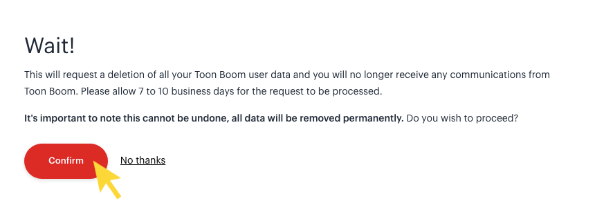 - Billing: Your billing information will be cleared, but some subscription data may be retained by Toon Boom for accounting/legal purposes.