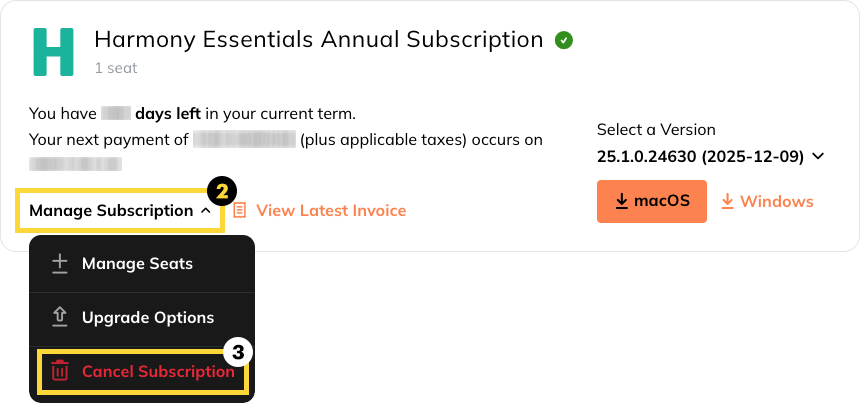 You can also access this page from the user dropdown menu at the top of the page. - In the subscription panel, open the Manage Subscription dropdown.