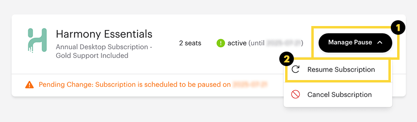 - In the subscription panel, click the Mange Pause dropdown button.