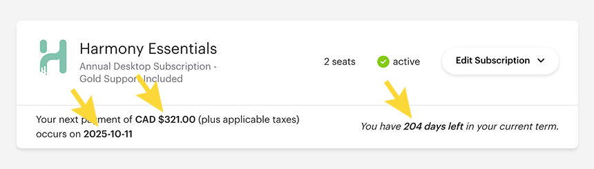 - At the bottom of the subscription panel, you will find your next billing date, along with the amount you will be paying, and the number of days left in your current term.