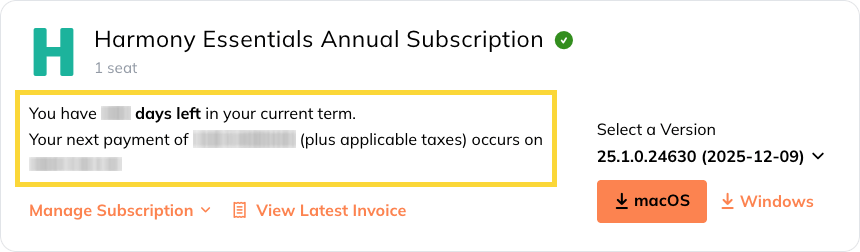 You can also access this page from the user dropdown menu at the top of the page. - In the subscription panel, you will find your next billing date, along with the amount you will be paying, and the number of days left in your current term.