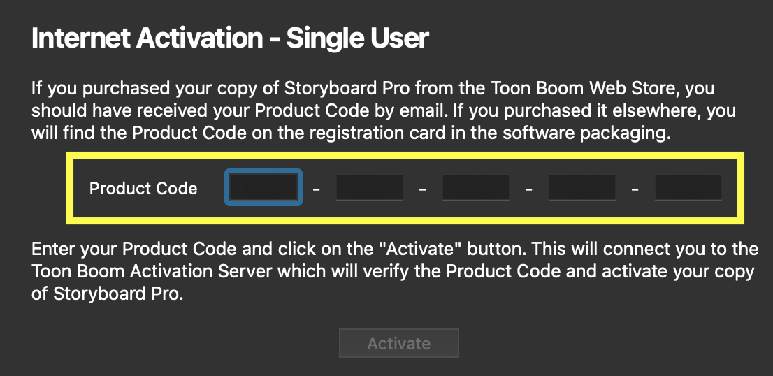 A Product Code can be activated by launching the Toon Boom Activation Wizard and using the Internet Activation options.