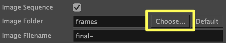 - Below Image Sequence, click the Choose… button, and pick a location the images will be saved to. If left as the default, they will be saved in the scene’s ‘frames’ subfolder.