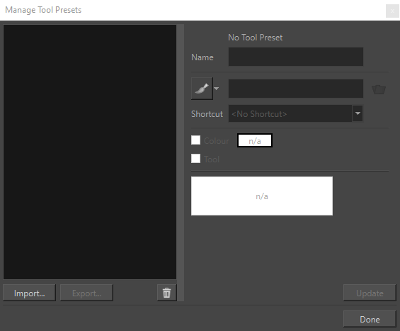 - You will return to the Manage Tool Presets dialog box. The imported presets will appear on the left side.