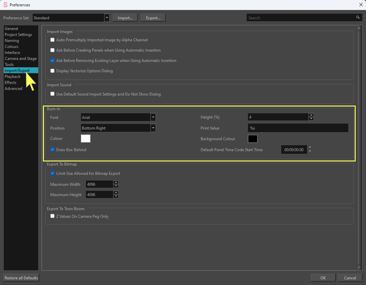 This article outlines how to change burn-in settings for all exports in current and future Storyboard Pro projects. If you’d like to know how to adjust burn-In settings when doing a single export, see How do I export my movie with a timestamp, subtitles, or overlay?