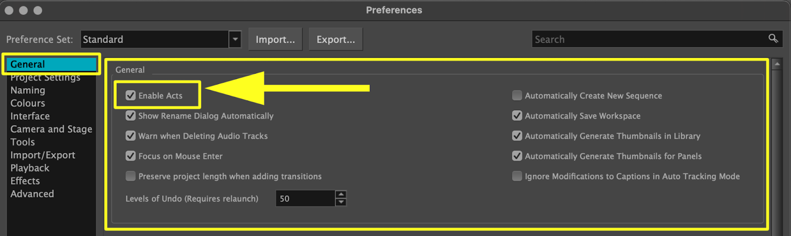 - Under the General section, check the Enable Acts option.