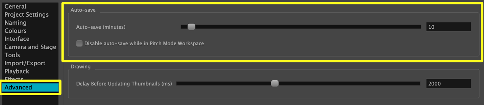- Check the Disable auto-save while in Pitch Mode Workspace option if you do not want the auto-save dialog box to interrupt you while using the Pitch Mode workspace.