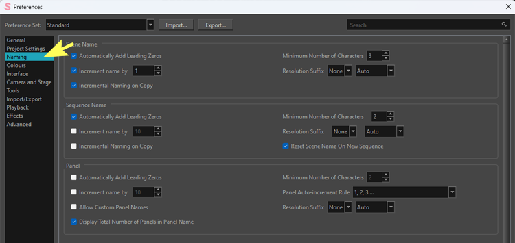 - In the Sequence Naming Rules, the option Reset Scene Name on New Sequence will restart the naming of scenes in a new sequence.