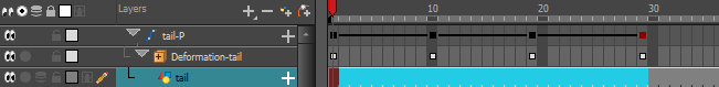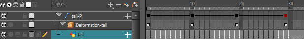 - In the Timeline view, locate the drawing layer that is under the deformer you want to bake down.