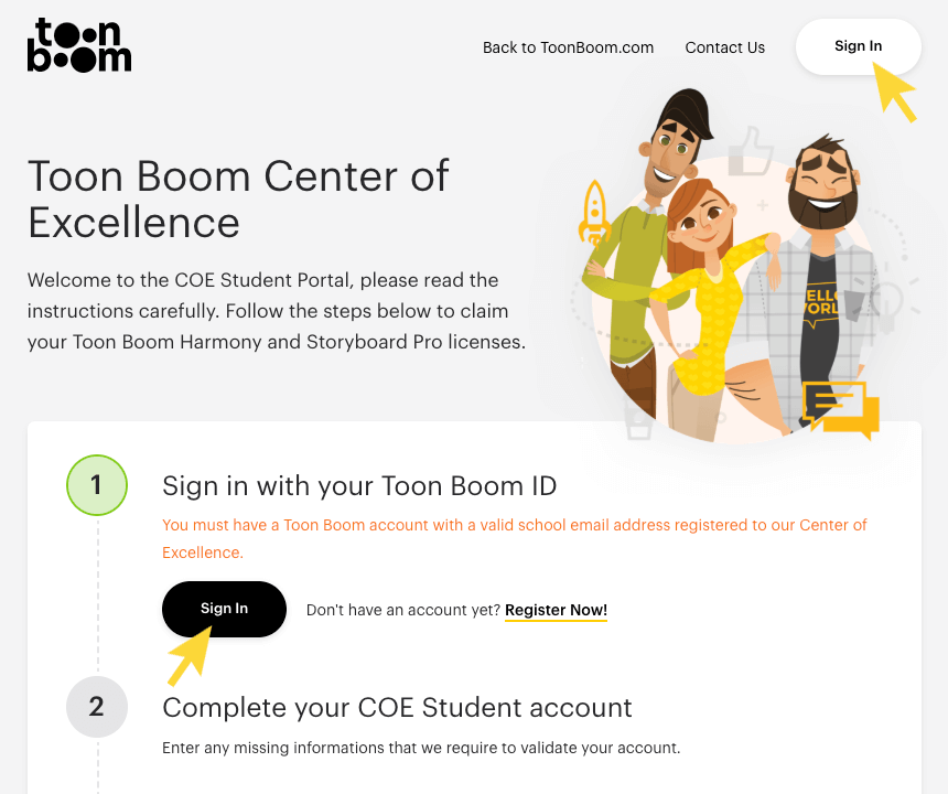 Please make sure that your Toon Boom ID is associated with your school e-mail. If your school e-mail is not recognized by the site, please contact your school’s administrator and confirm whether your school participates in the Toon Boom Centre of Excellence Program.