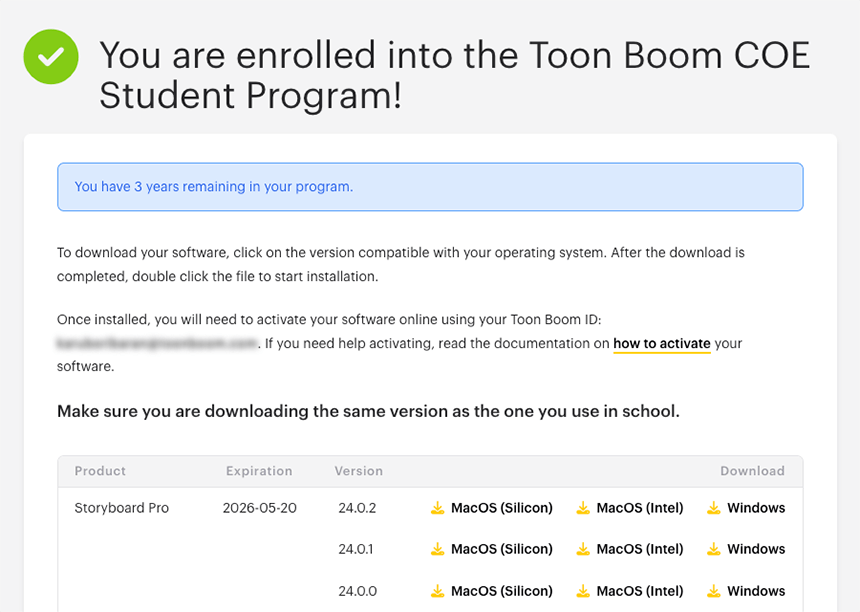- Follow the steps provided in How do I create a Toon Boom Account?. Make sure that your account is created using the e-mail address provided by your school.