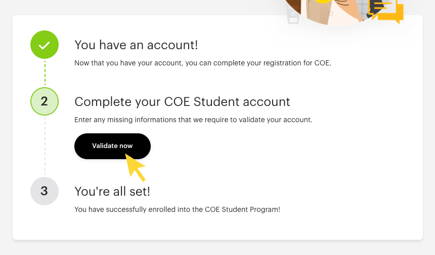 - In the COE Student Portal page, click on Validate Now.