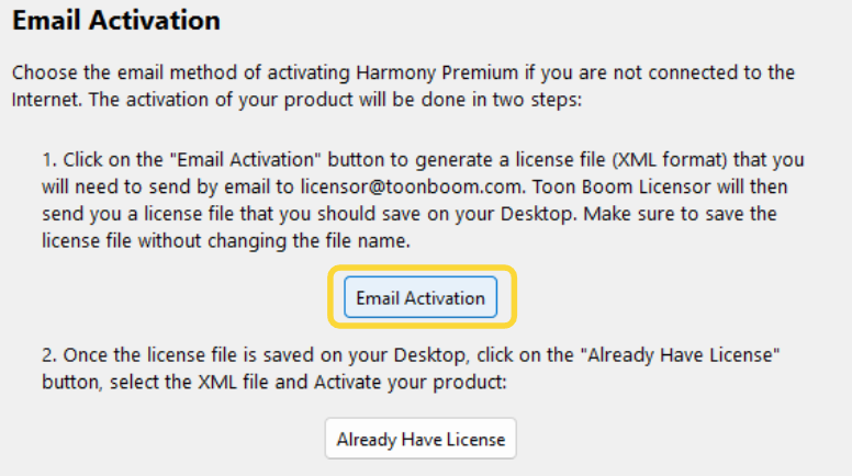 Please note that internet access will be required to send via the license activation request file via e-mail to Toon Boom.