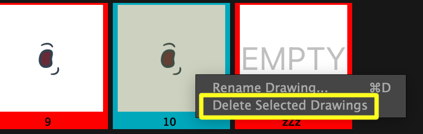 - In the Xsheet view, right click and select Drawings > Delete Selected Drawing/s.