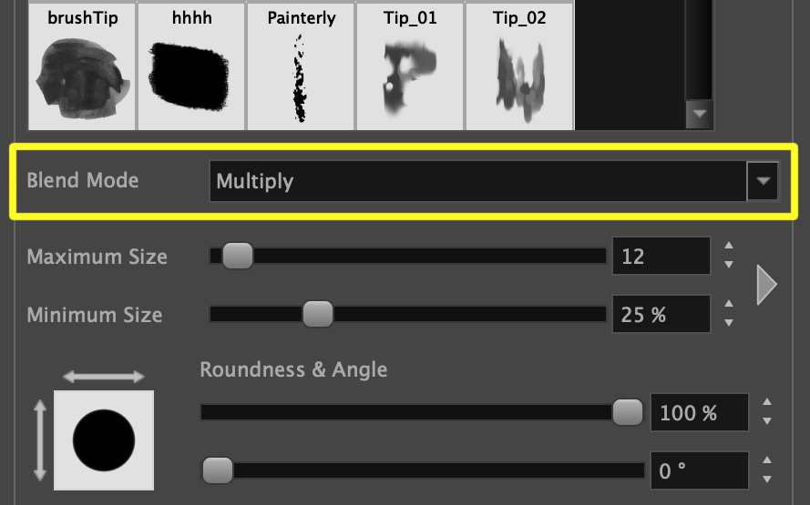 The Blend Mode is a unique dropdown in the Dual Tip tab, and determines how the Dual Tip will be blended with the primary tip: