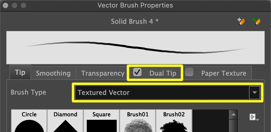 To access the Dual Tip options, the Brush type must be Textured Vector, and the Dual Tip tab must be ticked.