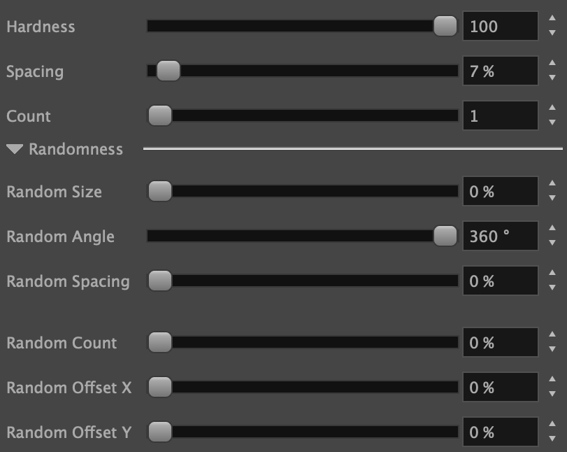 The Dual Tip tab is very similar to the Tip tab, with one or two slight changes. Just like in the Tip tab, a variety of tips are available, and unique tips can be created in third-party software and imported, and the Dual Tip effect can be previewed in the brush preview at the top of the window as you work with it.