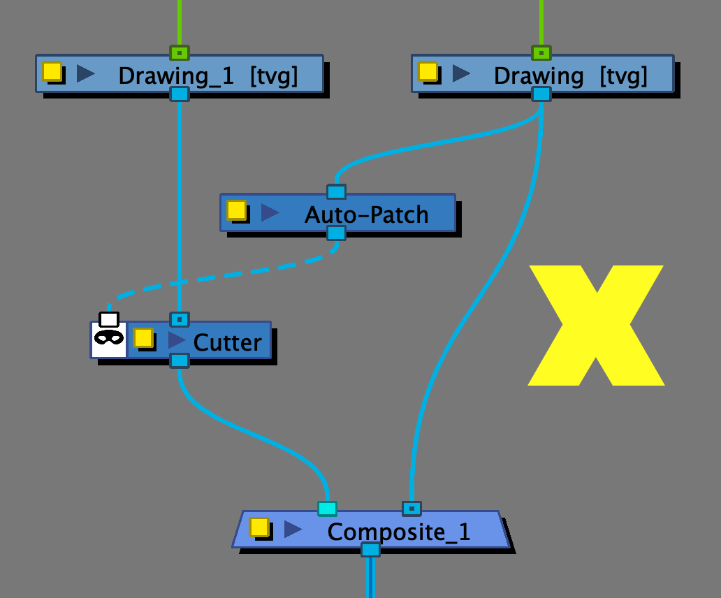 The Auto-Patch cuts the artwork on the Colour Art layer with the artwork on the Line Art layer, creating a cutter shape that is exactly on the edge of the adjacent artwork. These two shapes meeting precisely creates the anti-aliasing line in the Render view as the blurred pixels show the background colour through.