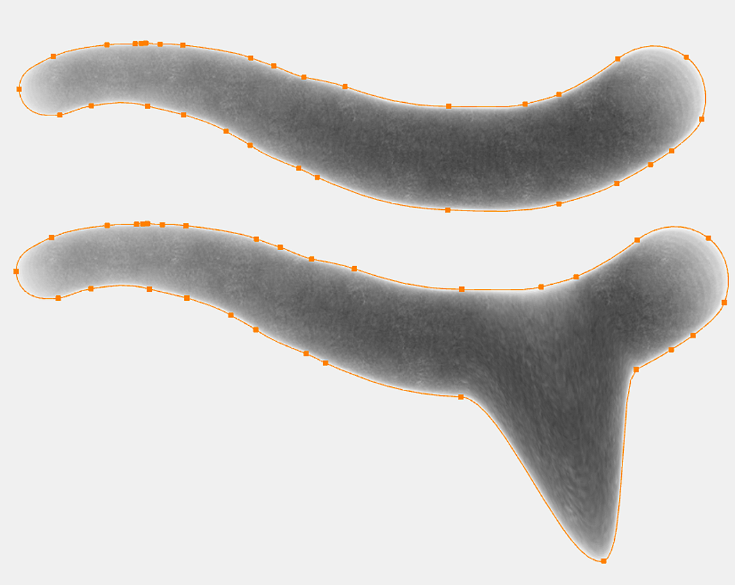 The Centerline Editor tool is made specifically for brush lines. This tool works similarly to the Contour Editor, except instead of editing the brush line with an envelope or contour, it allows you to edit the brush line with a spine, similar to how a pencil line is edited. This gives you more control over the overall shape of the line instead of just the outside shape.