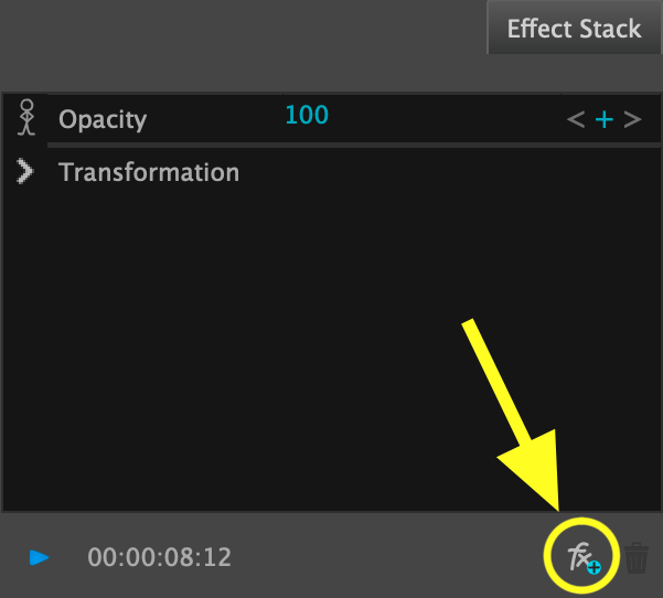 These effects can be found in the Add Effect menu at the bottom of the Effect Stack view. Opacity and Transformation is added by default.