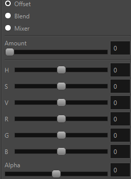 - Offset: The colour selection can be adjusted using the HSV, RGB and Alpha sliders below.
