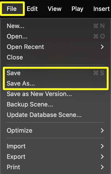 You can also save changes by using File > Save, or save copies of scenes by using the Save As option under File > Save As.