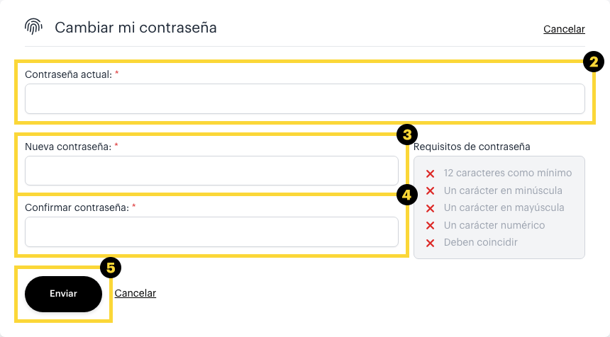 - En el campo Nueva contraseña, introduzca su nueva contraseña siguiendo nuestros Requisitos de contraseña de la derecha.