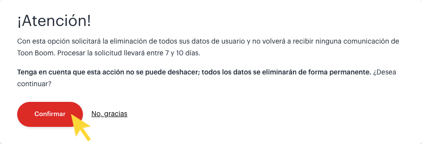 - Pérdida de datos: Se eliminarán todos los datos personales, de perfil, de producto y de contenido, incluidos los datos de otros sitios de Toon Boom (Learn Portal, COE, etc,.).