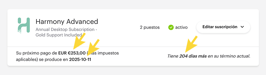- En la parte inferior del panel de suscripción, encontrará su próxima fecha de facturación, junto con el importe que pagará y el número de días que le quedan del periodo actual.