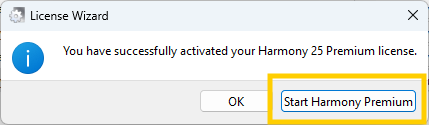 - Una nueva ventana se abrirá mostrando el estado de activación de su licencia. Puede hacer clic en Start Harmony Premium/Storyboard Pro para lanzar el programa, o hacer clic en Aceptar para concluir la activación de la licencia.