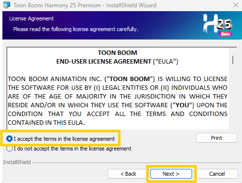 - Aparecerá el contrato de licencia de Toon Boom. Lea atentamente los términos y condiciones del acuerdo. Puede aceptar seleccionando I accept the terms in the license agreement. Haga clic en Next cuando haya terminado.