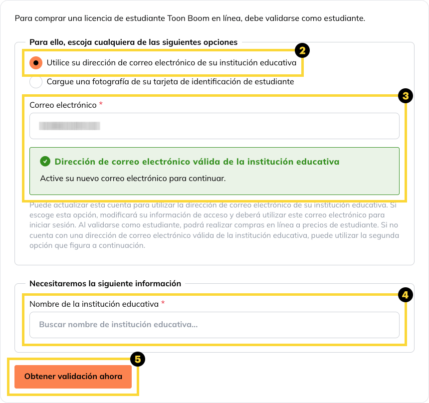 Los estudiantes que tengan una cuenta de Toon Boom vinculada a una dirección de correo electrónico asociada a su centro educativo pueden verificar su estatus de estudiante y disfrutar de descuentos.