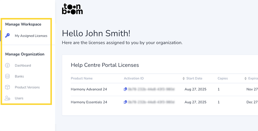 El Portal de Licencias Empresariales (ELP) de Toon Boom es una plataforma web para que las organizaciones vean y gestionan las licencias de Harmony y Storyboard Pro Flex. Con el ELP, puede activar, rastrear y renovar licencias fácilmente, así como añadir usuarios y asignar licencias a su equipo.
