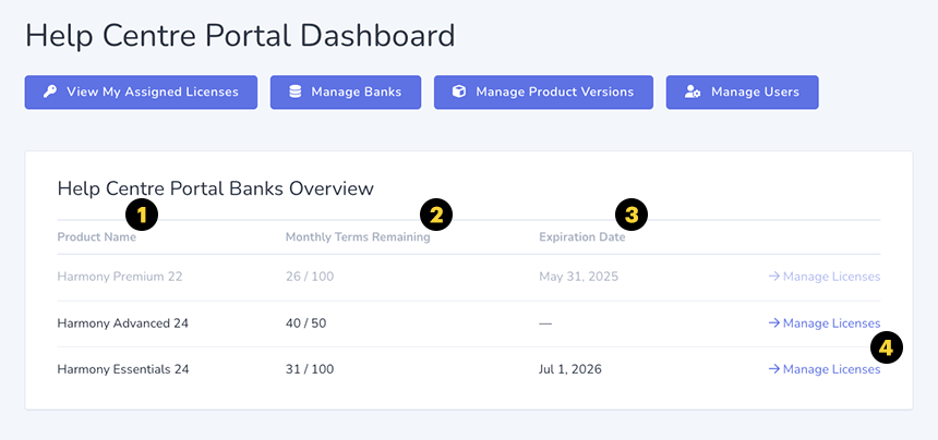 | NOTA: La función Reasignar licencias solo está disponible para los bancos que utilizan la versión 25.1 o posterior del producto y que están configurados con licencias portátiles. Si no ve los enlaces Devolver o Asignar para una licencia, consulte ¿Cómo puedo ponerme en contacto con el servicio de asistencia de Toon Boom?. |