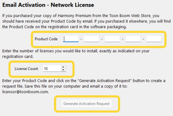 Tenga en cuenta que necesitará acceso a Internet para enviar el archivo de solicitud de activación de licencia por correo electrónico a Toon Boom.