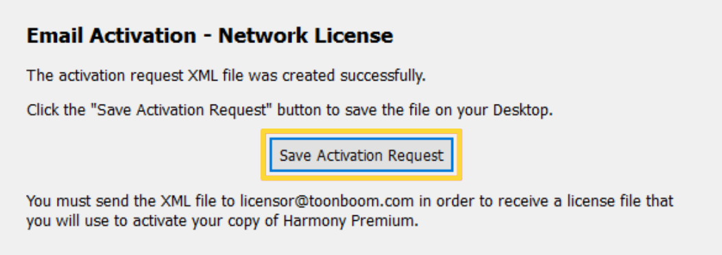En la siguiente pantalla, haga clic en Save Activation Request para guardar la solicitud en un archivo que podrá enviar al departamento de licencias de Toon Boom.