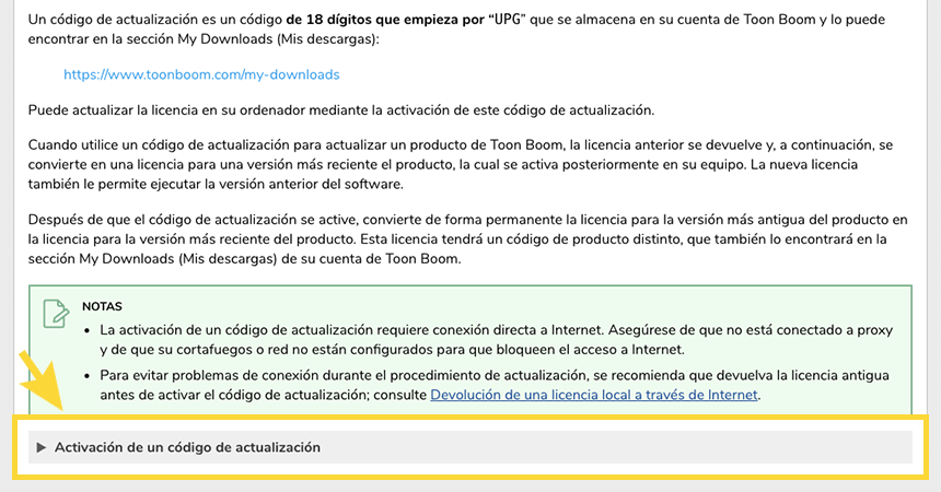 - Vaya a la sección Actualización de una licencia de la Documentación del producto Toon Boom.