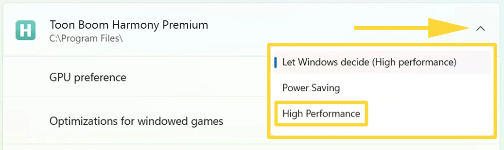 Para garantizar rendimiento y estabilidad al utilizar los programas Toon Boom, es esencial que su sistema utilice una tarjeta gráfica adecuada. De forma predeterminada, Windows puede dar prioridad al ahorro de energía sobre el rendimiento, asignando un chip gráfico integrado en lugar de a su GPU dedicada de alto rendimiento para correr el programa. Esto puede provocar problemas de visualización, retrasos o errores de renderizado.