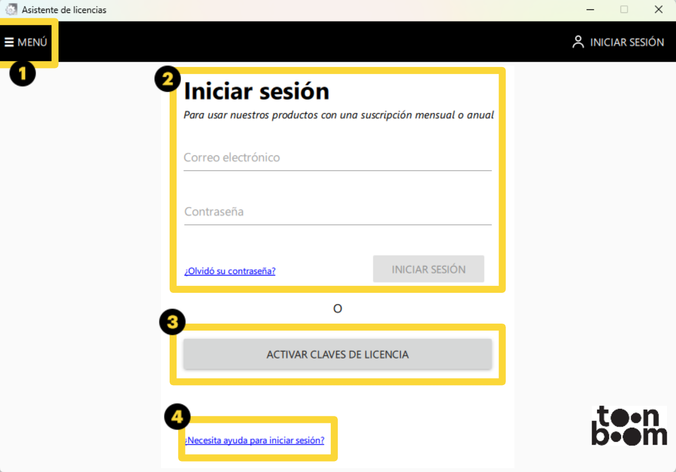 - Iniciar sesión: Inicie sesión en su cuenta con su ID de Toon Boom.