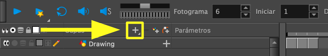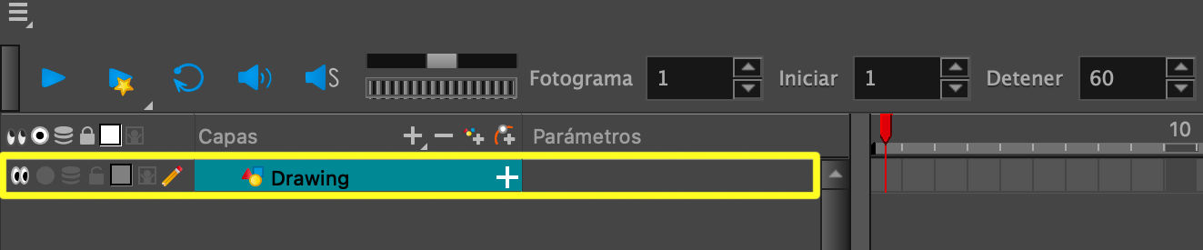 - Vista de Línea de tiempo: Esta vista contiene nuestras capas, fotogramas de dibujo y sincronización.