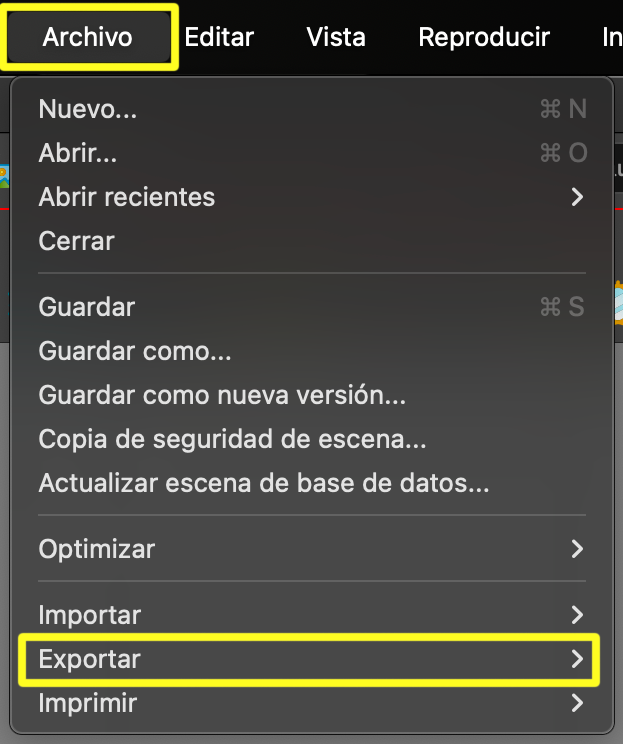 - Exporte su escena utilizando una de las opciones del menú Archivo > Exportar en la barra superior.