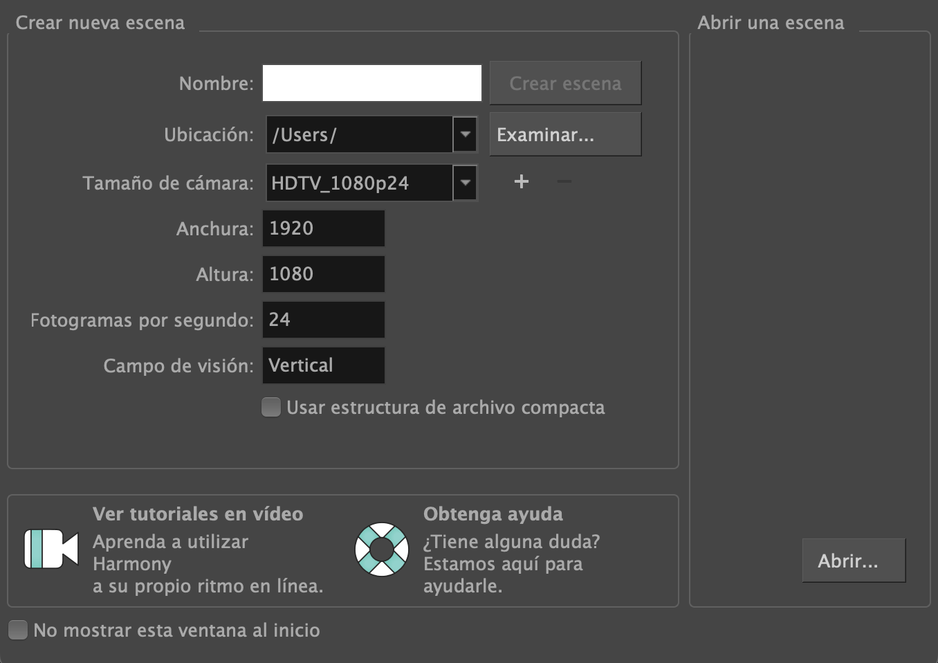 - Ignore los demás campos por ahora y haga clic en Crear escena para abrir un nuevo archivo Harmony.