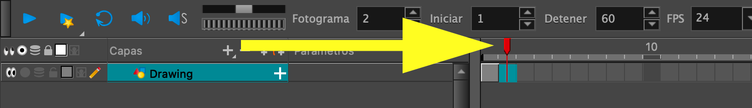 - Haga clic en la vista Línea de tiempo (1) y seleccione el segundo fotograma de la capa Dibujo (estará vacío). Esto moverá automáticamente el cabezal de reproducción a ese fotograma.