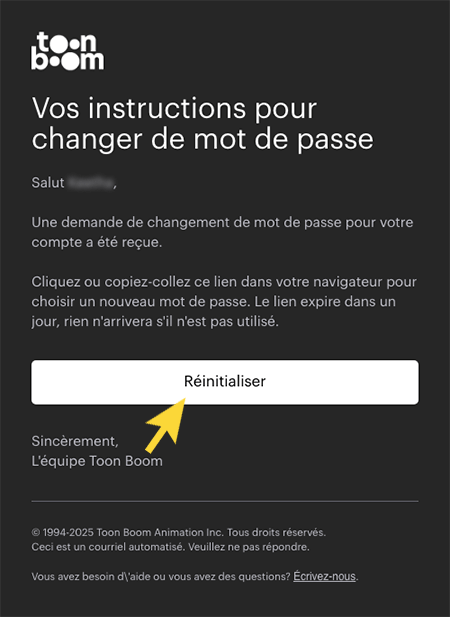 - Vous recevrez un e-mail contenant les instructions de réinitialisation du mot de passe. Ouvrez-le et cliquez sur le bouton Réinitialiser.