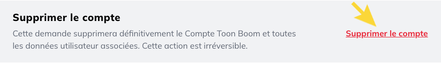 Vous pouvez supprimer votre Compte Toon Boom à tout moment. Veuillez prendre note de ce qui suit avant de procéder :