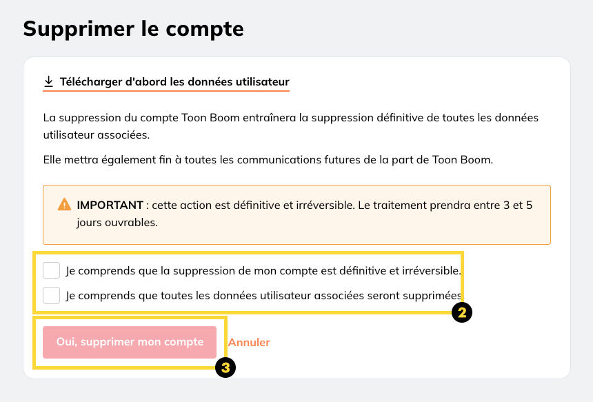 - Facturation : Vos informations de facturation seront effacées, mais certaines données d'abonnement peuvent être conservées par Toon Boom à des fins comptables/légales.