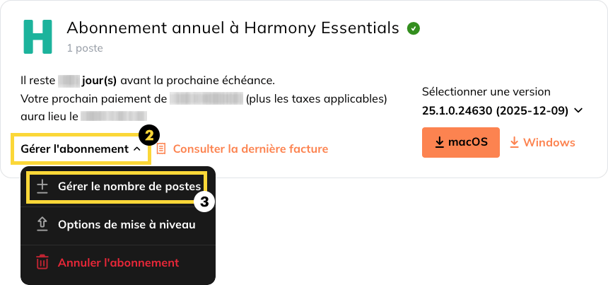 Vous pouvez également accéder à cette page depuis le menu déroulant de l'utilisateur situé en haut de la page. - Dans le panneau d'abonnement, ouvrez le menu déroulant Gérer l'abonnement.