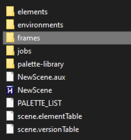 - Dans le dossier de la scène, trouvez le dossier intitulé « frames » et ouvrez-le: