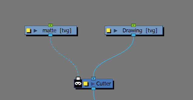 Un nœud «Cutter» en mode non-inversé (paramètre par défaut) utilise la forme du calque de dessin «Matte» (ci-haut connecté à gauche) pour masquer le calque «Drawing» (à droite). Dans la vue «Node», vous pouvez savoir visuellement si le nœud «Cutter» est non-inversé si son icône représente un masque blanc sur un fond noir