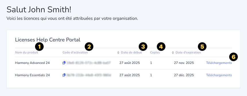 Cette page répertorie toutes les licences qui vous ont été attribuées par votre administrateur.